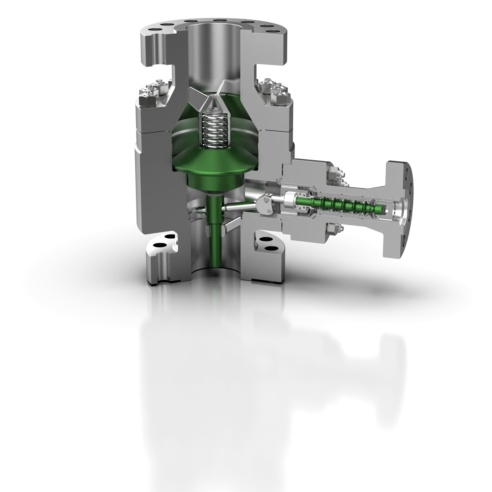 The bypass of the SIP valve is controlled by a multistage piston providing a near cavitation-free operation at any time thanks to the multistage pressure reduction at all flow rates. The piston also ensures a modulating flow control from 100 %–10 % bypass flow rate. An accelerated shut-off (1–2 sec.) at <10 % opening avoids most wear critical operation range. The wear-intensive extreme partial load range is deliberately overridden. The piston seat is separated from the pressure reduction and located at the high-pressure side. Thus, the shut-off function is optimally protected against cavitation attack. Even if cavitation would occur in the last throttle stages, the shut-off function would not be affected leaving the valve fully functional.