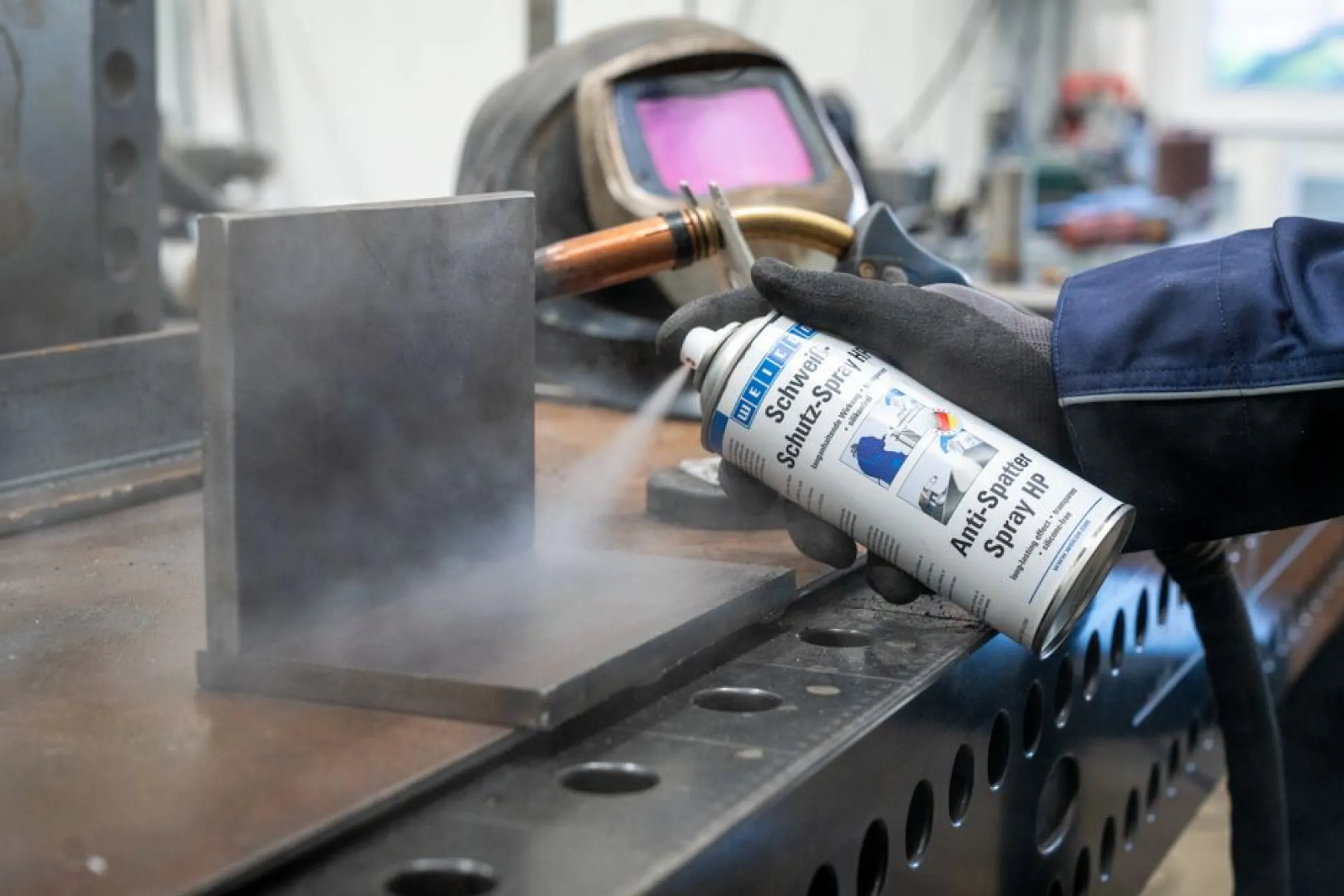 WEICON Anti-Spatter Spray HP is a high-quality release agent and lubricant and is used for cleaning welding tips, welding nozzles and gas nozzles. It also protects workpieces and surfaces to be welded from the adhesion and penetration of weld spatter without impairing the weld seam. The silicone-free Anti-Spatter Spray HP provides long-term protection for the treated surfaces. Using the spray minimises downtimes and interruptions in the production process for cleaning the welding equipment. The use of the spray eliminates the need to clean the workpieces with a spatula, brush or chisel. Post-treatment of the workpieces (such as bronzing, galvanising, anodising or painting) is possible without special cleaning. Cleaning, e.g. with WEICON Cleaner Spray S, may be necessary in the case of excessive spraying.