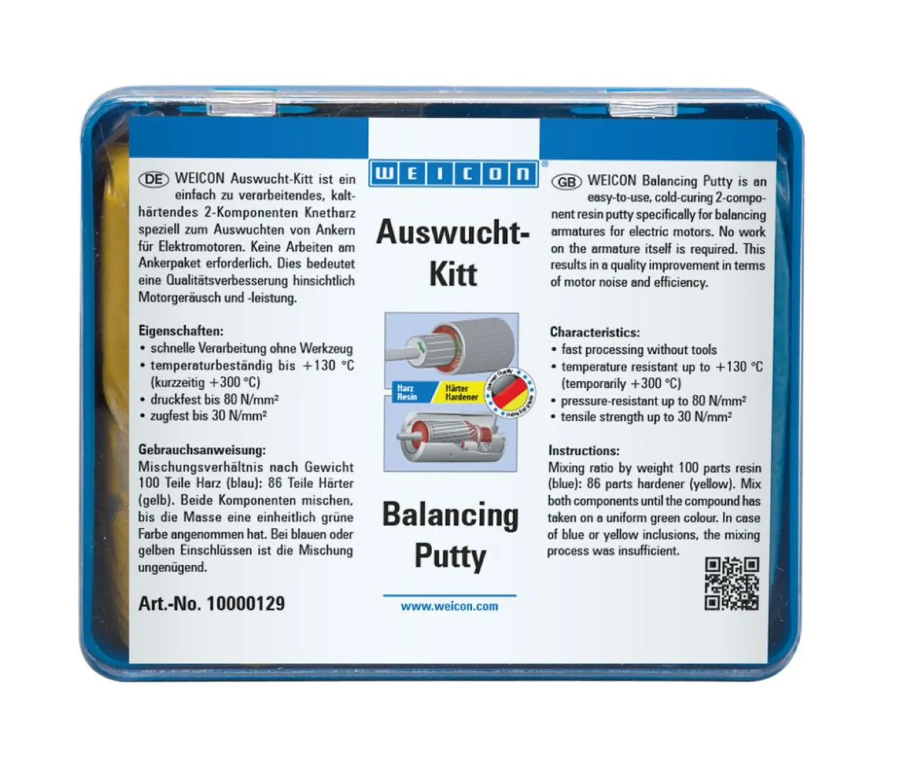 WEICON Balancing Putty is an easy-to-use, cold-curing 2-component epoxy resin system. The resin putty is used especially for balancing armatures for electric motors. Compared to machining processes such as drilling or milling, this type of balancing has several advantages. No tools are required for the processing of the balancing putty. And no work is required on the armature core. This results in a quality improvement in terms of motor noise and efficiency. The use of putty saves time, as e.g. deburring the balanced areas is not necessary. Armatures, which were single-plane balanced by machining, can be two-plane balanced with the Balancing Putty without requiring additional time. No metal chips are created, which can get caught in the winding and cause damage. The potential risk of accidents during drilling and/or milling is eliminated. For example, the Balancing Putty is not shaken off in the test run (in uncured condition) during the balancing process at 3000 rpm (diameter of the armature 40mm).